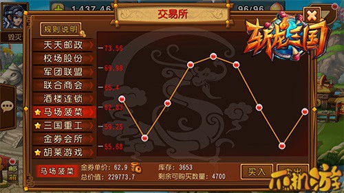 “交易所”类似我们现实生活中的证券中心,可以购买游戏中的股票,不过在《斩龙三国》里则是称为“金券”。可以看到每支金券都会有涨跌,而且每天的上午9点、中午12点、下午6点、晚上9点均会刷新一次价格,玩家要做的就是遵循“低买高卖”的原则赚取差价。