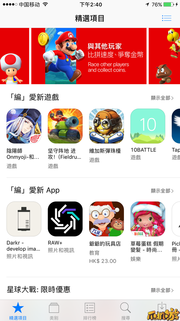 由于《超级马里奥·酷跑(Super Mario Run)》是热门应用,所以打开港服Apple Store就能在顶部广告位上看到相关的信息了,连搜索的功夫都省了。