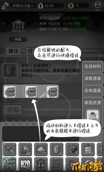 实验室是通过使用探索到的一些材料,用来合成一些道具或者资源的。有些道具会给配方,合成公式中,配方也是需要使用的材料,而有些没有配方,需要玩家动脑摸索。已经熔炼合成过的,可以进行快捷熔炼。