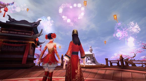在桃花掩映下的殿堂中,新人们抛撒喜糖、燃放烟花,宾朋们道贺祝福、载歌载舞……一场别致、浪漫的婚礼,足以让所有参与其中的玩家们铭记一生!