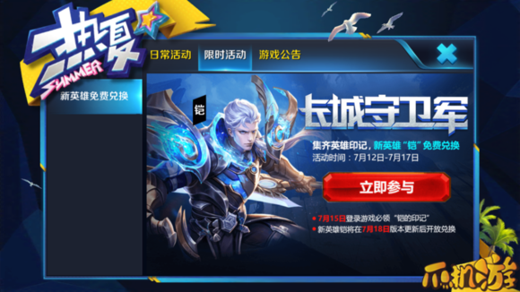 活动截止到本月17号,只要每天登陆游戏同时参加活动集齐7个不同的英雄印记,在7月18日至7月23日期间免费兑换新英雄“铠”!