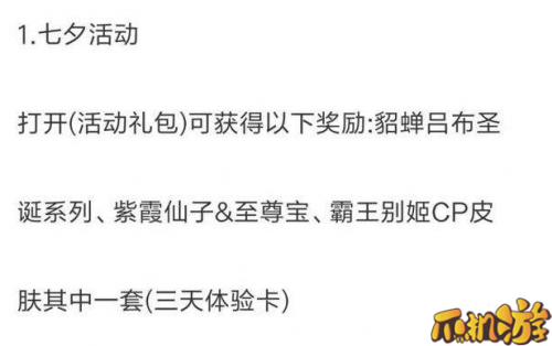 根据官方消息,玩家们在七夕当天登陆游戏后,在活动界面可以获得限时礼包,礼包内容为貂蝉/吕布圣诞系列皮肤、紫霞仙子/至尊宝皮肤、霸王别姬CP皮肤,玩家只能获得其中的一对皮肤,使用时间只有三天,说实话略坑哦,但是也算是福利啦!