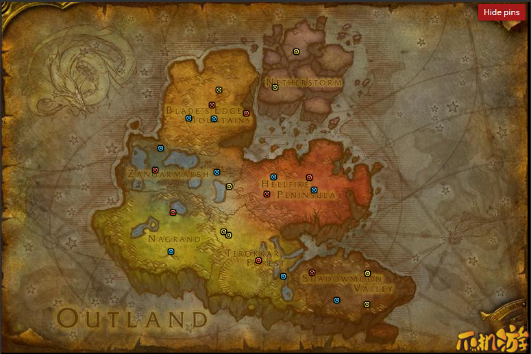 黄色为共有的(9)、蓝色为联盟专属(19)、红色为部落专属(21)、紫色为大灾变版本共有的(5)