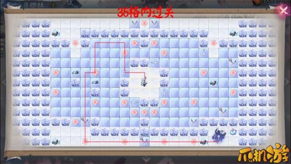 2、比较难的有移动35格子内完,这个是试炼四的任务,如下图红线标注走法就可以完成。