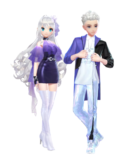 银白色短发彰显青春活力,几何元素夹克十分酷炫,极具未来科技感;银白色马尾灵动自然,紫色连体短裙青春活力,搭配白色运动鞋,动力十足!