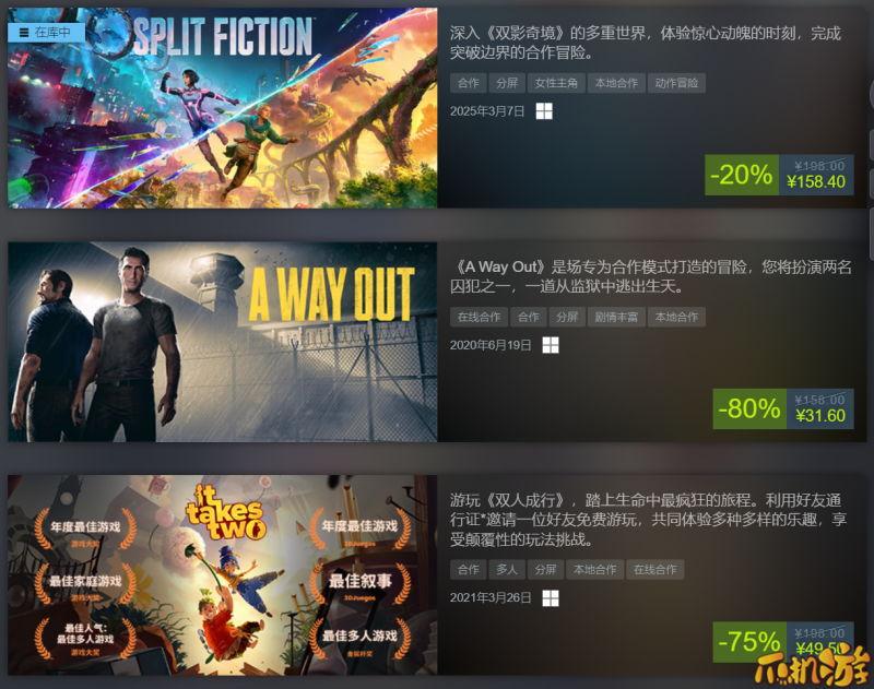 大促期间,另外两款来自 Hazelight 工作室的优秀合作游戏也将参与促销!即刻购买《逃出生天》立享二折优惠,你将扮演一名囚犯,与另一名囚犯一起逃出监狱。一开始紧张刺激的越狱计划,却转瞬间发生出人意料的转折,带来一段前所未见、情感交织而难以捉摸的冒险。即刻购买《双人成行》立享二五折优惠,踏上专为二人合作游玩打造的疯狂之旅。你们将扮演科迪和小梅携手闯关,在每个新关卡中掌握独特且彼此关联的角色技能。