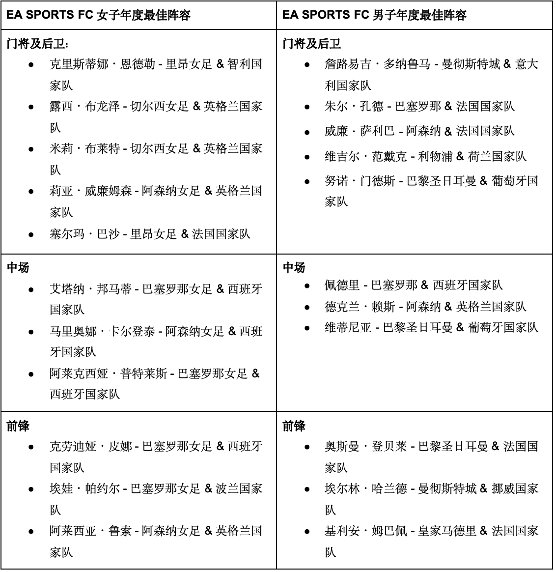 加利福尼亚州红木城 – 2026 年 1 月 16 日 —— 美国艺电公司(纳斯达克代码:EA)今日正式公布 EA SPORTS FC 男子及女子年度最佳阵容(TOTY),并首次推出男子及女子 TOTY 队长奖项 —— 以此表彰在 2025 年凭借卓越表现与领导力定义足坛的顶尖球员。